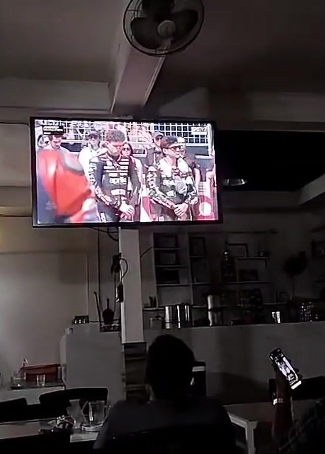 A still, indoor shot shows a television mounted on the wall of what appears to be a cafe or restaurant. The TV displays a scene of a group of people, some of whom are wearing racing attire. One person in the group is holding a large, red flag. Two individuals are seated at tables beneath the TV, one of whom is holding a smartphone, possibly recording or taking a picture of the TV. The room is dimly lit, with a ceiling fan visible above the TV. A shelf filled with various items is visible in the background.