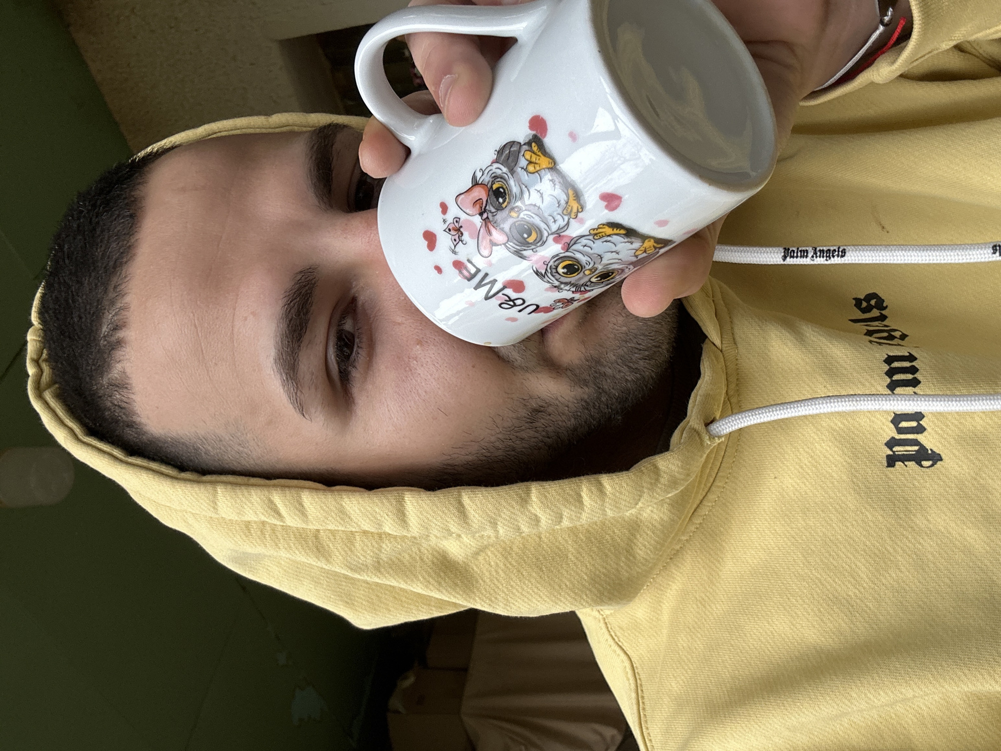 A close-up image depicts a male individual, partially visible from the chest up, in Slavyani, Bulgaria. The subject has short, dark hair, visible stubble on his face, and dark eyebrows. He is wearing a yellow hooded sweatshirt with the hood pulled over his head. The sweatshirt features a white drawstring with "Palm Angels" printed in black text. The subject is holding a white ceramic mug to his mouth with his right hand, appearing to drink from it. The mug is decorated with two cartoon owls, one larger with a pink bow and the other smaller, surrounded by red hearts and the text "U & ME". The background is dark, out of focus, and indistinct, showing faint shapes consistent with an indoor or covered outdoor area, with a diffuse light source visible in the upper background.