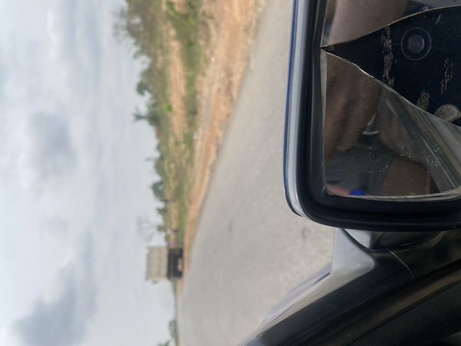 The image depicts a roadside scene in Owo, Nigeria, captured from the interior perspective of a moving vehicle. In the immediate foreground, the dark blue bodywork and a damaged right-side rearview mirror of the capturing vehicle are visible. The mirror glass is severely fractured, exhibiting multiple cracks, most notably a triangular segment missing or deeply separated in the upper right portion, reflecting indistinct shapes. Beyond the vehicle's perspective, a two-lane asphalt road extends into the distance under an overcast sky. Approximately 100-150 meters down the road, a large, light-colored dump truck is observed from its rear, positioned on the right shoulder of the road. To the right of the road, the shoulder consists of reddish-brown earth with sparse, dry vegetation and some green foliage. Further into the background, the terrain rises gently, covered with more natural vegetation, including scattered trees and shrubs under the cloudy conditions. Blurry figures or small structures are faintly discernible near the roadside in the mid-distance, to the right of the dump truck.