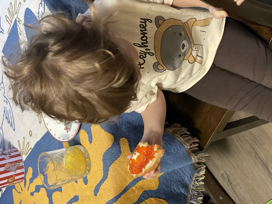 A child wearing a beige t-shirt with a cartoon bear design and brown leggings sits at a wooden surface. They hold a piece of bread topped with butter and red caviar. Nearby, a glass filled with yellow liquid rests on a patterned blue and yellow blanket. A small plate with a red border is visible, alongside a red and white box. The child's head is covered in brown hair.