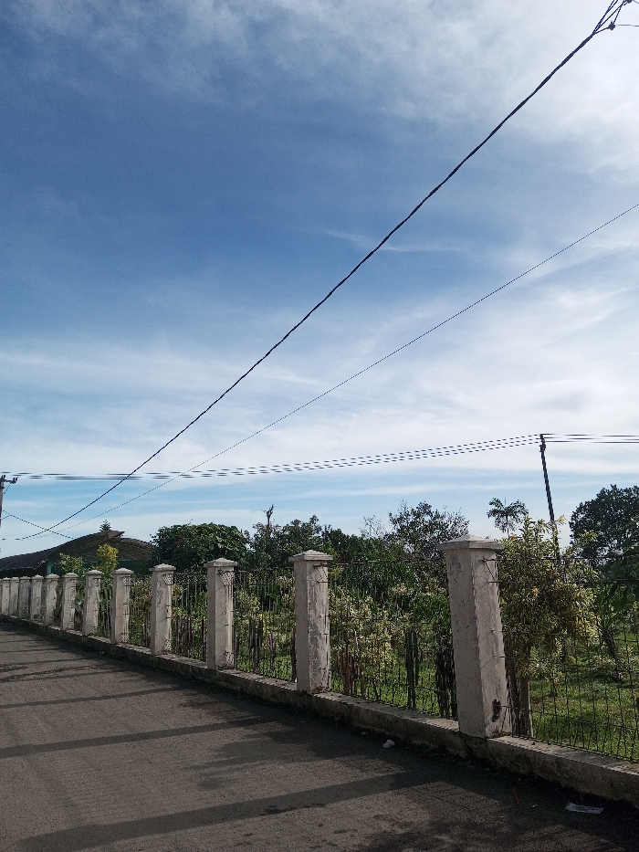 The image captures an outdoor scene in Salai Har Htan, Myanmar, under bright daylight conditions. The foreground features an asphalt road or path, extending from the lower left towards the center-right, displaying distinct dark shadows cast from the right side. Along the right edge of the road, a fence is present, composed of regularly spaced, light-colored concrete pillars, some appearing weathered, interconnected by a dark wire mesh. Behind the fence, a dense area of green vegetation, consisting of various trees and shrubs, is visible. In the mid-ground to the far left, a structure with a dark, sloped roof is partially observable through the foliage. Overhead, multiple dark electrical power lines traverse the blue sky diagonally and horizontally. The sky is predominantly clear with wispy white cirrus clouds scattered throughout. A dark utility pole stands on the far right, supporting some of the power lines. No individuals or active interactions are visible within the frame.