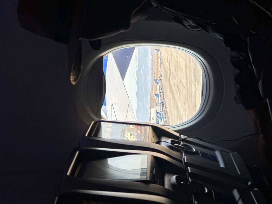 Inside an airplane, a passenger's view through the window shows a wing and an airport runway. Several parked airplanes are visible against a backdrop of mountains. An in-flight entertainment screen is mounted on the seat in front, reflecting the outside scene. The interior of the plane is dimly lit, with dark shades along the upper right and top left corners.