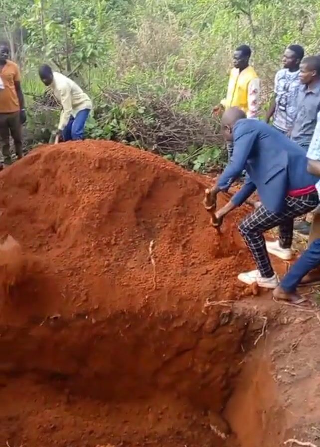 A group of people stand around a large hole in the ground. Several people are shoveling red dirt into the hole. One man in a suit holds a wooden cross and a book. The background is a wooded area. It appears to be a burial scene.