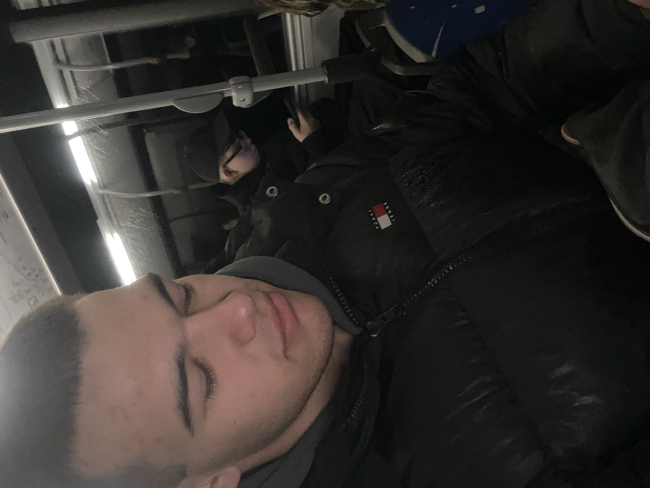 A selfie shows a person with short, dark hair and closed eyes, wearing a grey hoodie under a black puffer jacket with a visible Tommy Jeans logo. Another person wearing a black cap is partially visible in the background, seemingly holding onto a rail. The setting appears to be public transportation, potentially a bus or train, due to the presence of a handrail and other passenger areas in the background.