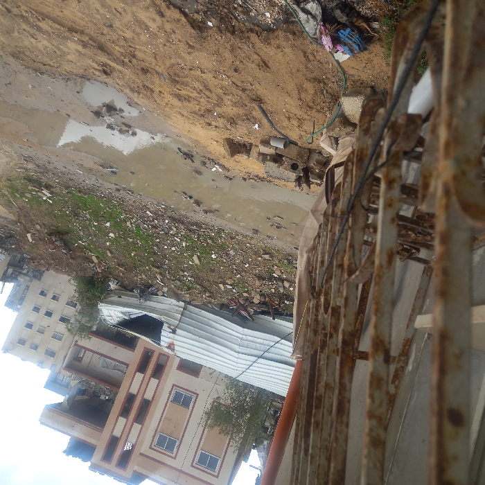 The image depicts a scene of widespread destruction in the city of Khan Yunis, Palestinian Territory. In the immediate foreground on the left, blurry, severely rusted vertical metal bars are visible. The ground below consists of disturbed sandy soil mixed with mud, featuring several large, murky puddles. Scattered debris includes concrete blocks, sections of gray piping, and discarded, soiled textiles. The midground is dominated by a sloped mound of earth and construction rubble. Resting on this mound is a significantly crumpled structure composed of white corrugated metal sheeting, indicative of a collapsed or heavily damaged building component. Sparse green vegetation is visible among the debris. In the background, multiple multi-story buildings exhibit severe structural damage. A prominent light-brown building features visible damage to its facade, missing windows, and a partially collapsed upper level and roofline. Another building to its right appears similarly compromised. The sky above is overcast. No individuals or active movements are depicted in the scene.