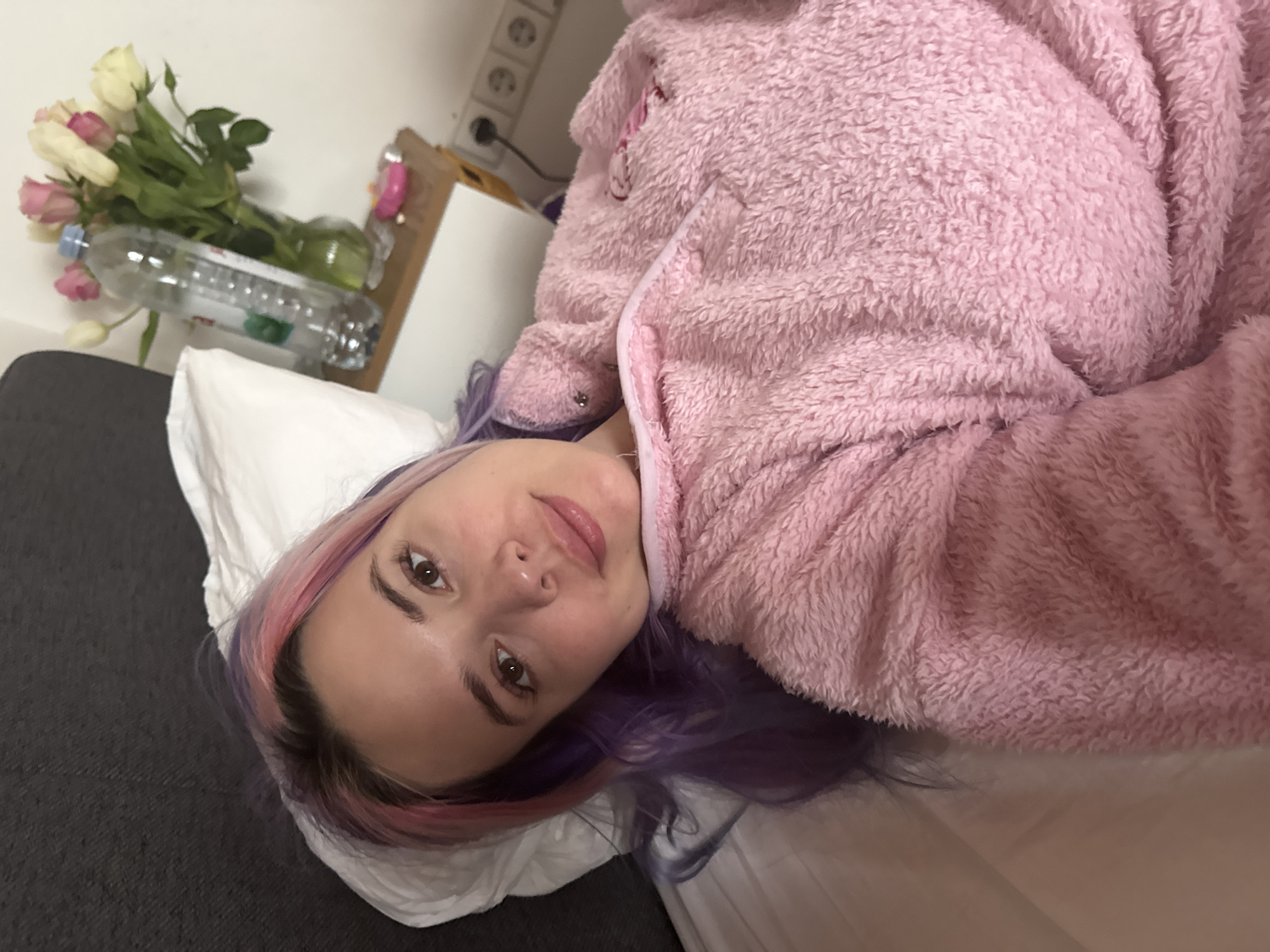 A young female subject is depicted lying in a bed, her head resting on a white pillow. Behind the pillow, a dark grey headboard is visible. The subject has light skin, brown eyes, and hair colored with distinct pink and purple hues. She is wearing a light pink, fuzzy, long-sleeved garment. The subject is looking directly towards the camera with a subtle smile. To her right, a light brown wooden nightstand is present. On the nightstand, a clear plastic water bottle with a blue cap and a clear glass vase containing a bouquet of pink and white roses are visible. A small pink object is also located on the nightstand. The background wall is white, featuring a white electrical outlet with multiple sockets, into which a black cable is plugged. The scene is an indoor bedroom setting, located in the City of Zagreb, Croatia.