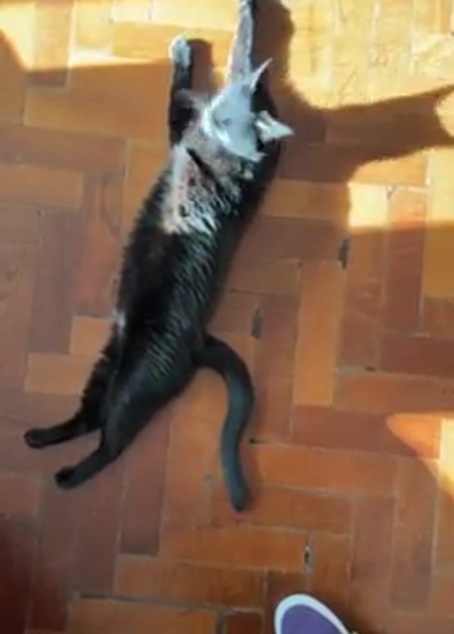 A black cat with white patches is lying on its back on a wooden floor, bathed in sunlight. The camera angle is a high-angle shot. The cat is stretched out, with its paws in the air and tail curled. A person wearing sneakers is partially visible at the bottom of the frame. A "pop" sound can be heard, presumably the sound of a can being opened. The cat then meows.