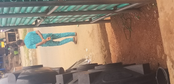 The image captures an outdoor urban scene in Ado-Ekiti, Nigeria, characterized by commercial activity and mixed ground surfaces under daylight. In the immediate foreground, a light brown concrete surface, possibly a step, transitions to a reddish-brown dirt and gravel ground. On the left, a stack of multiple large, black, cylindrical plastic water tanks partially frames the scene, with a black bucket with a metallic handle visible on the concrete step near them. A tangled white cable and a coiled dark green rope lie on the dirt ground. A narrow dirt ditch or gutter separates this unpaved area from a light grey paved road. On this paved road, a single adult male stands with his back to the camera, facing away. He is dressed in a light blue/teal patterned short-sleeved top and matching trousers, indicative of traditional Nigerian attire, and wears brown sandals. His hands are clasped behind his back. In the background, beyond the man and the road, several items suggest commercial or food preparation activity. These include a wooden table supporting multiple metallic cooking pots and bowls, a black pot on a stand, and a green plastic bucket on the ground. The far background shows reddish-brown earth formations and sparse green vegetation along the road's edge.