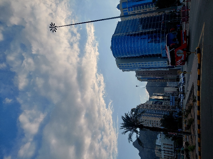 A cityscape features modern buildings, including a prominent blue glass-clad structure. A decorative street lamp stands tall against a blue sky filled with fluffy white clouds. A red bus is parked beside the road. In the distance, mountains rise behind other buildings and a palm tree adds a touch of nature to the urban scene.
