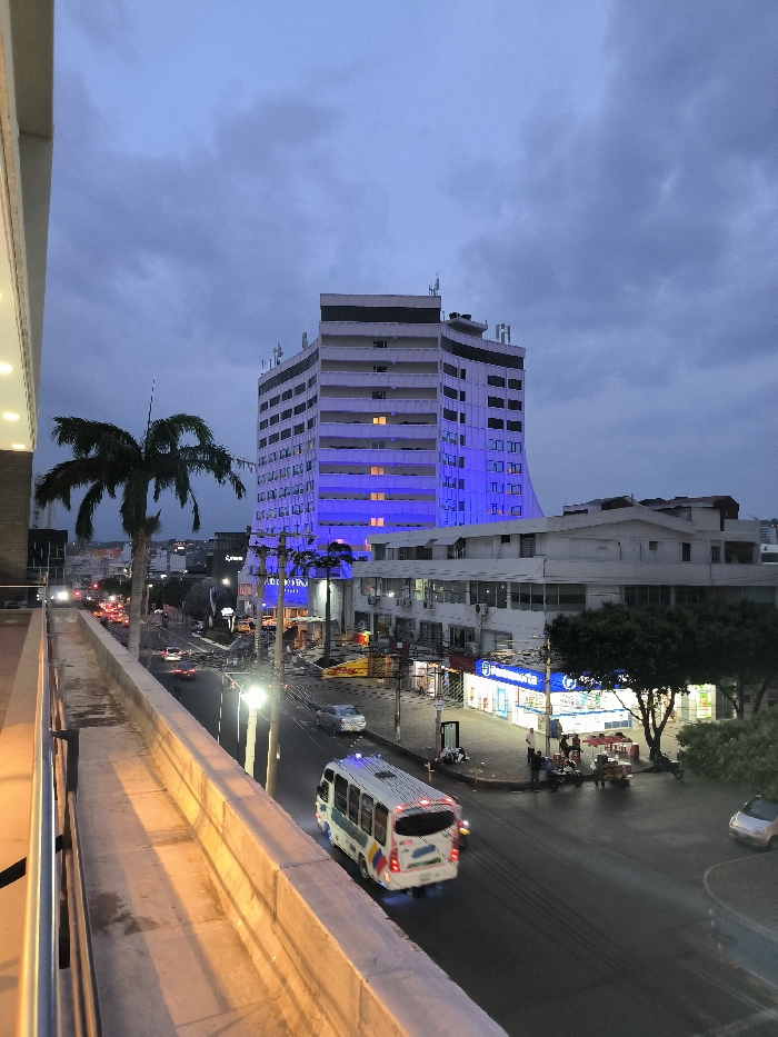 An elevated urban view under a cloudy sky features a tall, white building illuminated with blue light. A palm tree stands nearby. A street scene unfolds with cars and a white bus. A pharmacy is visible along the street, with people nearby. A building with a white facade and a tree are on the right side. The view is from a balcony with a stone railing.