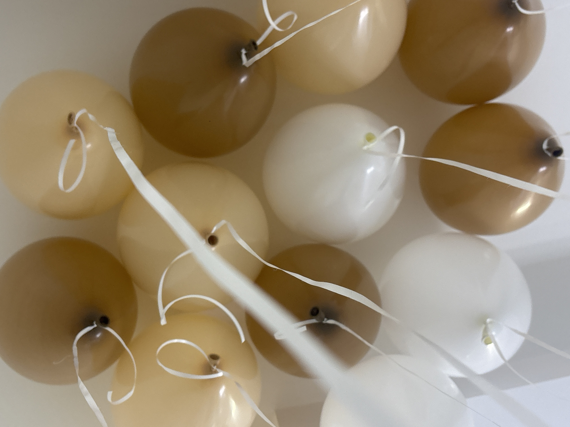 close-up view of several balloons, predominantly in shades of white, beige, and light brown