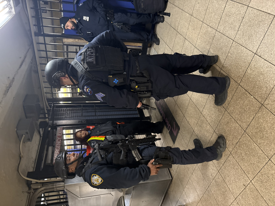 In a subway station, three NYPD officers, one with a rifle, stand near a turnstile with an “EMERGENCY EXIT” sign