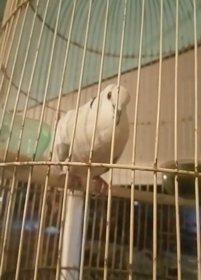 A close-up shot shows a white bird, possibly a dove, inside a wire cage