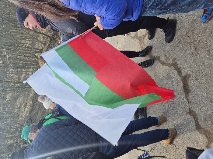 The image depicts an outdoor gathering of several individuals on a paved path at the edge of a wooded area. The scene is identified as being in Chargan, Bulgaria; however, no specific urban landmarks are visible within the image to corroborate this. In the foreground, slightly right of center, a Bulgarian national flag is held upright by a wooden pole. The flag displays horizontal stripes of white, green, and red from top to bottom. A person on the far right, wearing a blue puffer jacket, blue jeans, and blue and orange athletic shoes, supports the flag pole with their right hand. To the right of the flag, a male individual is seen in profile, facing left, with his mouth slightly open, suggesting speech or observation. He wears a dark beanie, a dark jacket with a red trim detail, dark trousers, and black shoes. Other individuals are partially visible. Behind the flag, a person wears a light-colored knit beanie with a pom-pom. On the far left, another individual is seen from behind, wearing a dark blue quilted jacket, blue jeans, and tan boots. Further left and behind, a green cap and a green backpack are visible on another person. The ground surface is a light gray paved material, possibly asphalt, exhibiting irregular dark stains or cracks. The background consists of a dense arrangement of bare deciduous trees on a slight incline, indicative of a forest or heavily wooded area. The lighting appears diffused.