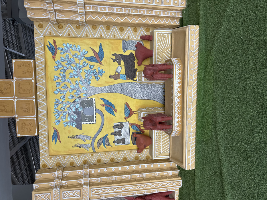 An elaborate indoor cultural display from Bhopal, India, is presented on a surface of artificial green grass