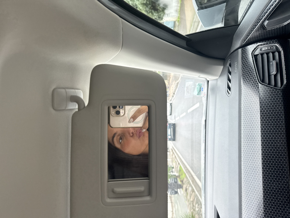 This image presents a view from the passenger compartment of a vehicle traveling on a street in Antibes, France. The light-grey sun visor on the passenger side is flipped down, revealing a rectangular mirror. Reflected in this mirror is a female subject with dark hair, visible from the forehead to the lower jaw, making a pouting expression with her lips. She holds a light-colored smartphone, appearing to be an iPhone, with her right hand, capturing a selfie. A white circular MagSafe-compatible accessory is visible on the rear of the phone. The car's dashboard, visible below the windshield, is grey with a prominent patterned, dark grey geometric panel and features an "AIRBAG" label above a vent. The scene outside the vehicle, viewed through the windshield, shows a wet asphalt road with white solid line markings, suggesting recent rain. Several vehicles are visible in the distance. The roadside on the left features a stone curb and scattered greenery. A rectangular white and green sticker, consistent with a French Crit'Air vignette, is affixed to the lower right corner of the windshield.