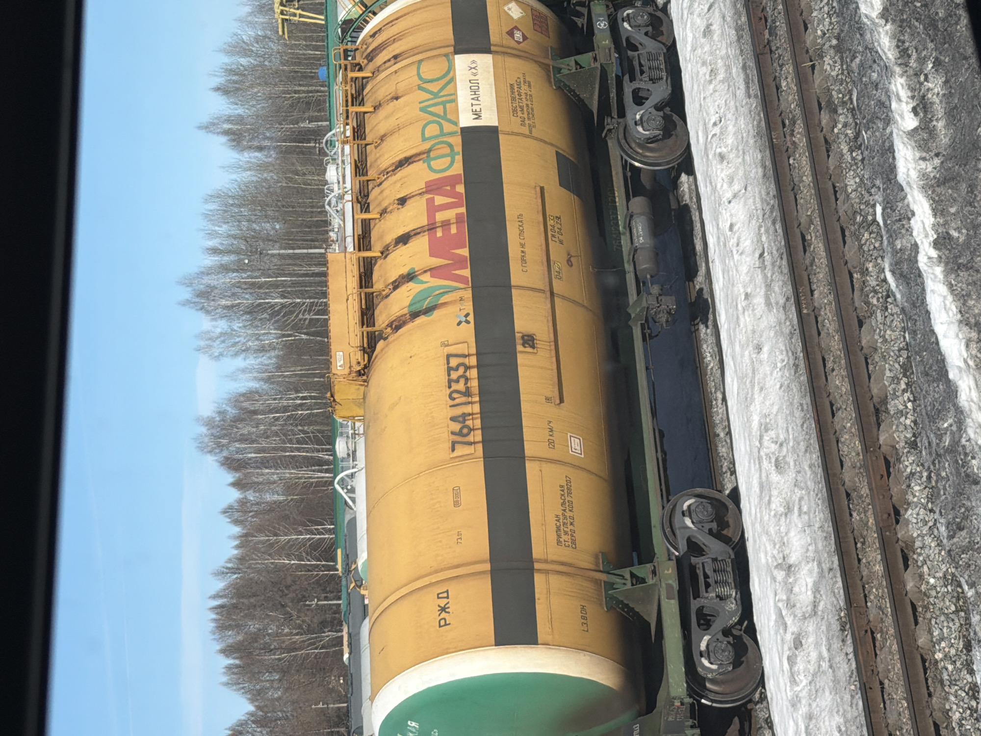 The scene depicts a stationary, cylindrical tanker railcar on a railway track within the city of Agryz, Russia. The railcar is predominantly yellow with a green end cap and a black horizontal stripe. It bears the identification number 76412337 and is prominently marked with the "МЕТАФРАКС" (METAFRAX) logo, a green leaf emblem, and the text "МЕТАНОЛ «Х»" (METHANOL "X"), indicating its contents. Additional markings include "РЖД" (Russian Railways), "120 КМ/Ч" (120 km/h), hazard diamond symbols (class 3, 33), and ownership details specifying PJSC "METAFRAX" and assignment to Uglegural'skaya station. The railcar rests on dark green bogies with black wheels. The ground surrounding the tracks is covered with a mix of snow and gravel ballast. In the background, multiple other railcars are partially visible, followed by a dense line of leafless deciduous trees under a clear, light blue sky. Faint industrial structures are discernible in the far background. No individuals or active events are depicted.