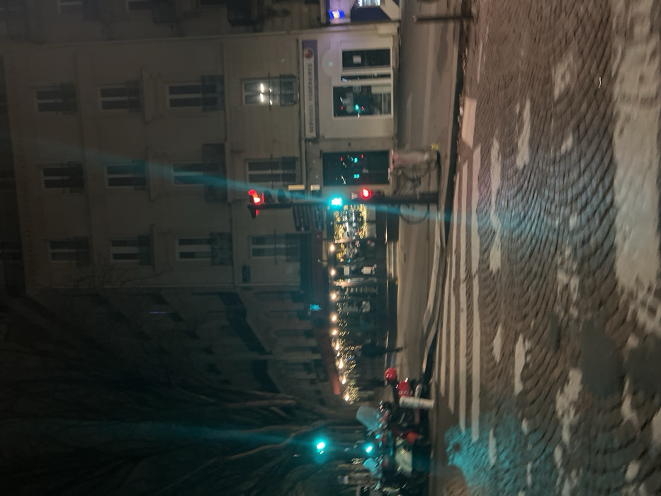 A street scene at night reveals a building façade with multiple windows and a storefront below. Traffic lights are visible, both red and green. A row of parked motorcycles lines the sidewalk. A cobblestone street stretches into the distance, reflecting ambient light and streetlights. The sidewalk has crosswalk markings. Bare trees and their branches appear dark in the foreground.