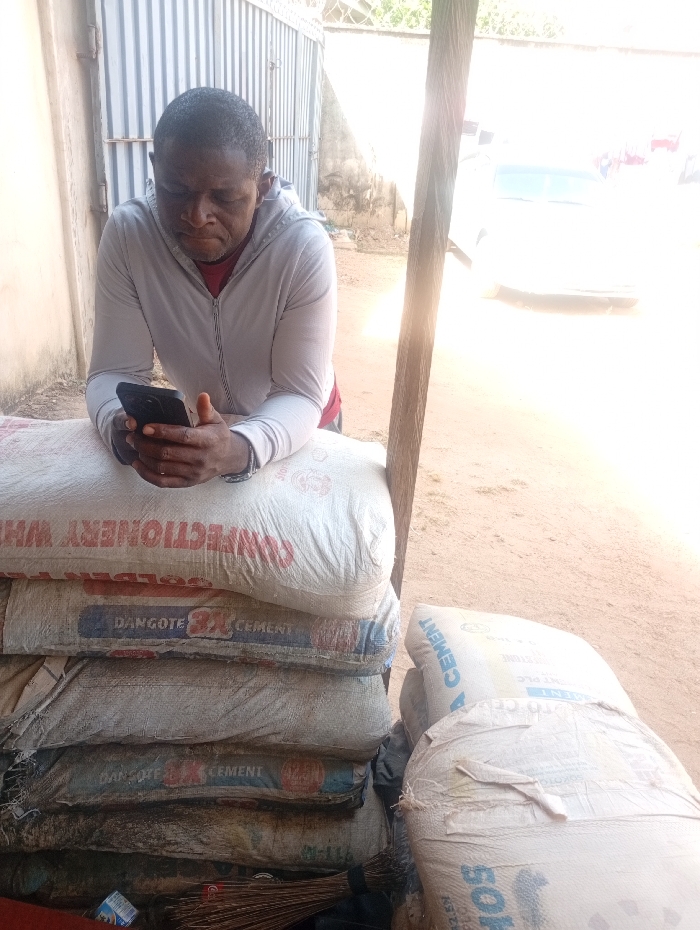 An adult male stands in an outdoor, brightly lit commercial or roadside setting in Jos, Nigeria