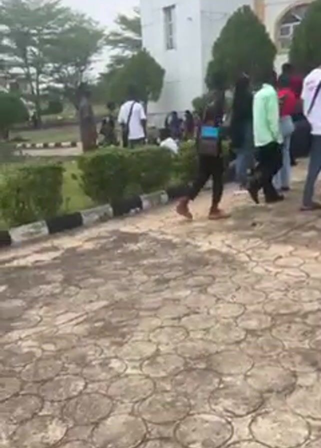 crowd of people gathered outside a building. The people are dressed in a variety of clothing, some in formal attire and others in casual wear. Many carry bags or backpacks. Some are standing, some are sitting, and some are walking. The environment is an outdoor space with trees, bushes, and a paved area. A building with large windows is visible in the background. The weather appears to be overcast. People seem to be conversing and using their phones. The overall scene appears to be a public gathering or a school setting with students.