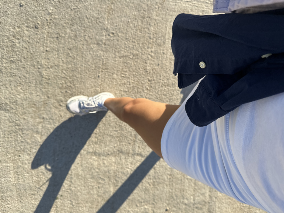 The image presents an overhead, downward-looking perspective of a person's lower body on a light-colored, textured concrete or asphalt surface in Skala, Greece. A single tanned leg is visible, positioned diagonally, wearing a white athletic shoe on the right foot. The leg emerges from a light-colored garment, likely a white skirt or dress. A dark blue long-sleeved shirt, folded or held, with a visible light-colored button, rests near the subject's hip area. Strong sunlight illuminates the scene, casting distinct, elongated shadows of a person's torso and an unidentified object onto the ground to the left of the visible leg.