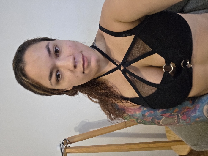 A woman poses in a black bra with a complex strappy design and mesh details. Her left arm is covered in colorful tattoos. She has medium-length brown hair and a fair complexion. The background includes a light-colored wall and a wooden structure. Her expression is calm and her gaze is directed at the camera.