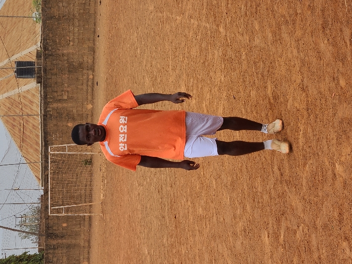 The image depicts an outdoor, unpaved sports field in Barakin Lerawi, Nigeria, under an overcast sky. A single adult male, appearing to be of African descent, stands centrally. He wears an orange short-sleeved t-shirt with white Korean characters "안전요원" printed on the chest, white athletic shorts, light-colored socks, and light-colored athletic shoes. He is positioned in a slight mid-stride, with his arms relaxed at his sides, and he looks directly at the camera with a neutral expression. In the background, to the left of the subject, stands a white metal soccer goal frame without a net. To the right, a low, light-colored cinder block wall is visible, topped by a brown corrugated metal roof with a black water storage tank mounted on it. A chain-link fence extends across the upper background, with sparse green foliage and trees visible beyond it. The ground is reddish-brown earth, indicative of dry, sandy soil.