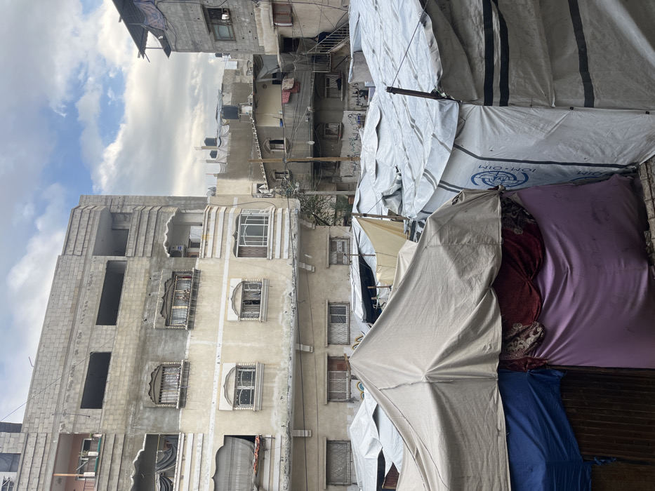 The image depicts a densely populated urban area in Nuseirat, Palestinian Territory, under an overcast sky with scattered white and grey clouds. In the immediate foreground, numerous makeshift shelters are visible, constructed from various materials including light grey, beige, and white tarpaulins, as well as blue, maroon, and pink fabrics. One prominent tent on the right displays the blue "IOM OIM" logo, indicating the International Organization for Migration. Support poles and ropes are evident for these temporary structures. Behind the temporary shelters, a cluttered midground features a utility pole with multiple wires running vertically. A male individual in a dark blue shirt is partially visible on an external staircase of a building in the mid-right. A wall in the midground shows some indistinct writing or graffiti. The background is dominated by multi-story residential buildings. The most prominent building on the left is a five-story structure. Its top two floors consist of exposed grey concrete blocks, appearing unfinished, with rectangular openings for windows. The lower three floors are finished with a light yellow/beige facade, featuring decorative arched and rectangular windows, some with security bars, and small balconies. Clothes and tarps are visible hanging from some windows and balconies. Multiple black water tanks are situated on the rooftops of various buildings throughout the background, indicative of residential water storage. Other buildings, constructed from concrete blocks, are visible to the right and further back, contributing to the dense urban environment.