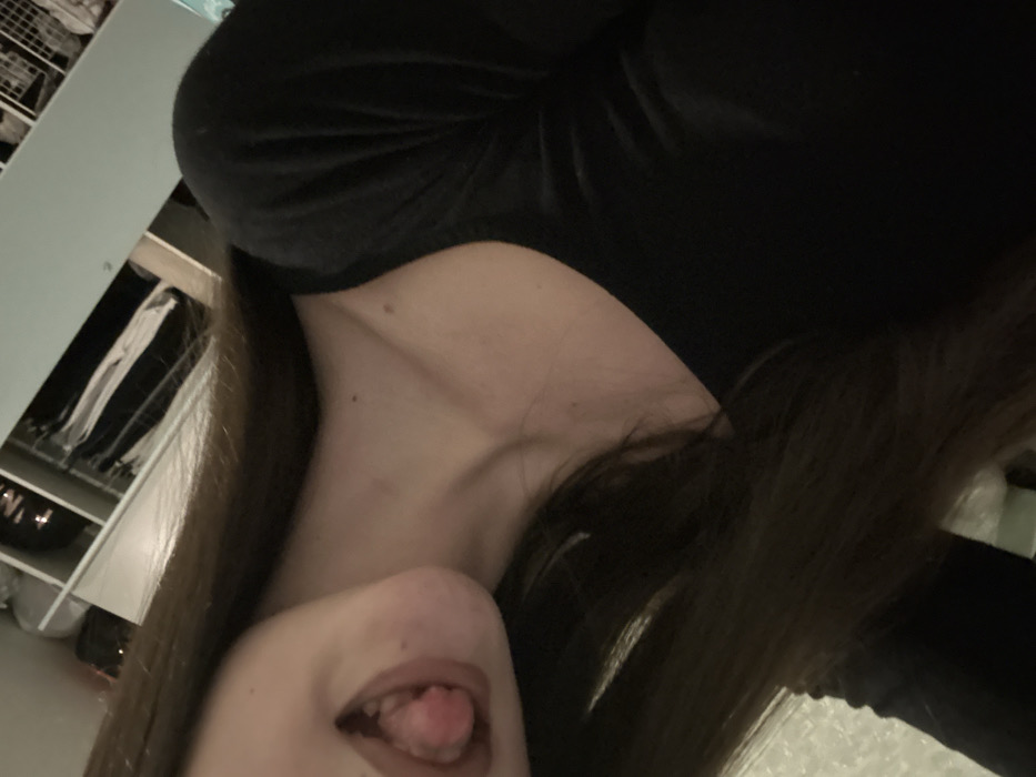 A woman with long brown hair is featured in an upside-down view. She wears a black top that accentuates her neck and collarbone. Her mouth is slightly open, revealing her tongue. A white closet with garments is partially visible in the background. The image is dimly lit, with a focus on the woman's features.