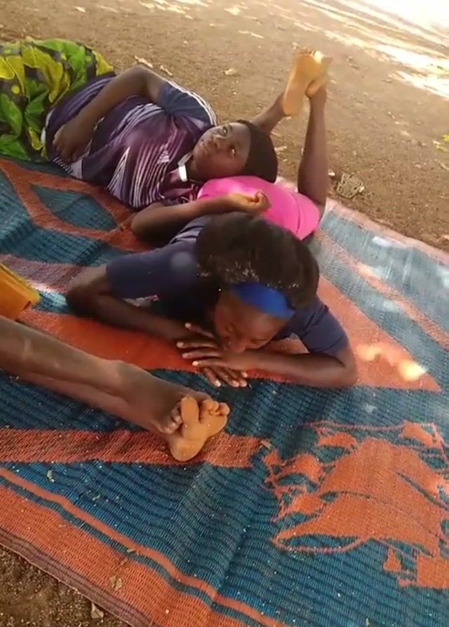 Two young women are lying on a woven mat outside on a partly sunny day, while an adult is visible near them. One of the women is wearing a pink shirt and a purple and white patterned shirt. She is lying on her back with her legs up in the air. The other woman is wearing a navy blue shirt and a blue headband. She is lying on her stomach with her head resting on her hands. The adult is wearing a yellow and brown patterned top, and their legs are visible near the woman in the blue shirt. The mat has a blue and orange geometric pattern. The ground around the mat is dirt. There is a green patterned item near the heads of the two women. There is a tree providing shade to the group.