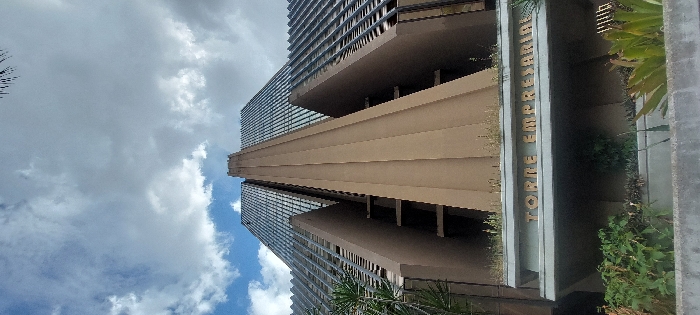 The image showcases a tall building reaching towards the sky. The building's design is characterized by a central beige section that gradually widens as it ascends, flanked by two mirrored glass structures. The sky is partly cloudy, with patches of blue peeking through. A sign reading "TORRE EMPRESARIAL" vertically flanks the building, partially obscured by foliage.