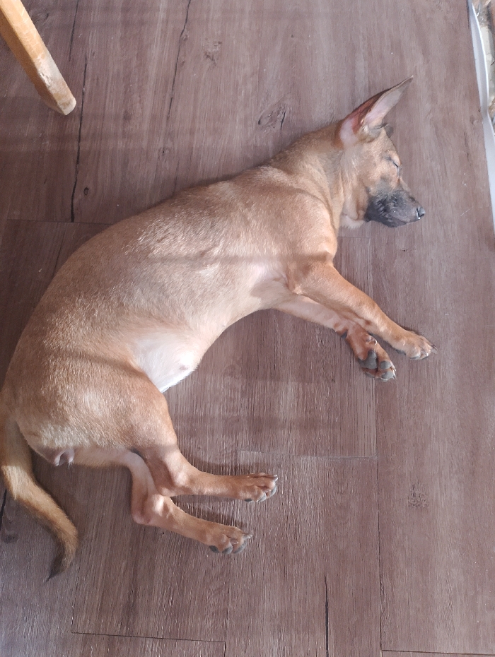- "A tan, short-haired dog is observed lying asleep on its right side on a light brown, wood-patterned floor" by FM-QjQR02, licensed under CC BY 4.0