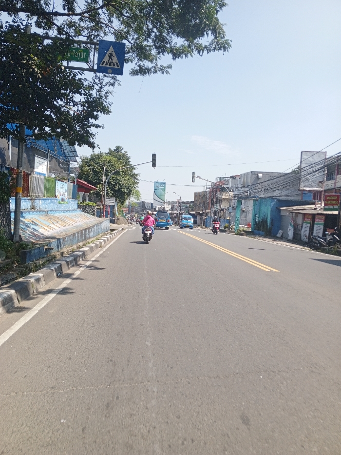 This image depicts a wide asphalt road under a clear blue sky, presumably in Multhan, India, during daylight hours. The road features a double yellow line in the center, separating traffic lanes, and a solid white line bordering the left shoulder. On the left side of the road, a raised concrete curb with grey and white sections is present, alongside a blue-painted concrete retaining wall or barrier. Beyond this, a utility pole supports overhead wires, and lush green foliage from an overhead tree partially obscures the upper left frame. A green street sign with partially visible white text, reading "Tajur," is mounted below a blue square sign featuring a white pedestrian crossing symbol. Further left are various buildings, some painted blue. On the road itself, a person wearing a pink long-sleeved shirt is operating a black motorcycle, traveling away from the camera in the primary lane. Further down the road, a blue minivan is visible, followed by a lighter blue minivan. Several other motorcycles with riders are observed in the distance, also moving away from the camera. The right side of the road is lined with various commercial and residential structures of differing heights and conditions. Utility poles and a dense network of overhead electrical wires are visible. A prominent sign for "WARKOP MARMINO" is affixed to a building on the right. Further down the road, a billboard with blue and green elements and indistinct text is visible. Two black traffic signal heads, mounted on poles over the roadway, are present; the closer one appears to show a red light. The scene indicates active traffic flow in an urban or semi-urban environment.