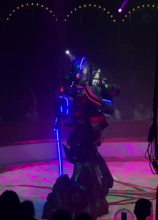 A large, green, illuminated robot stands in the center of a brightly lit circus ring