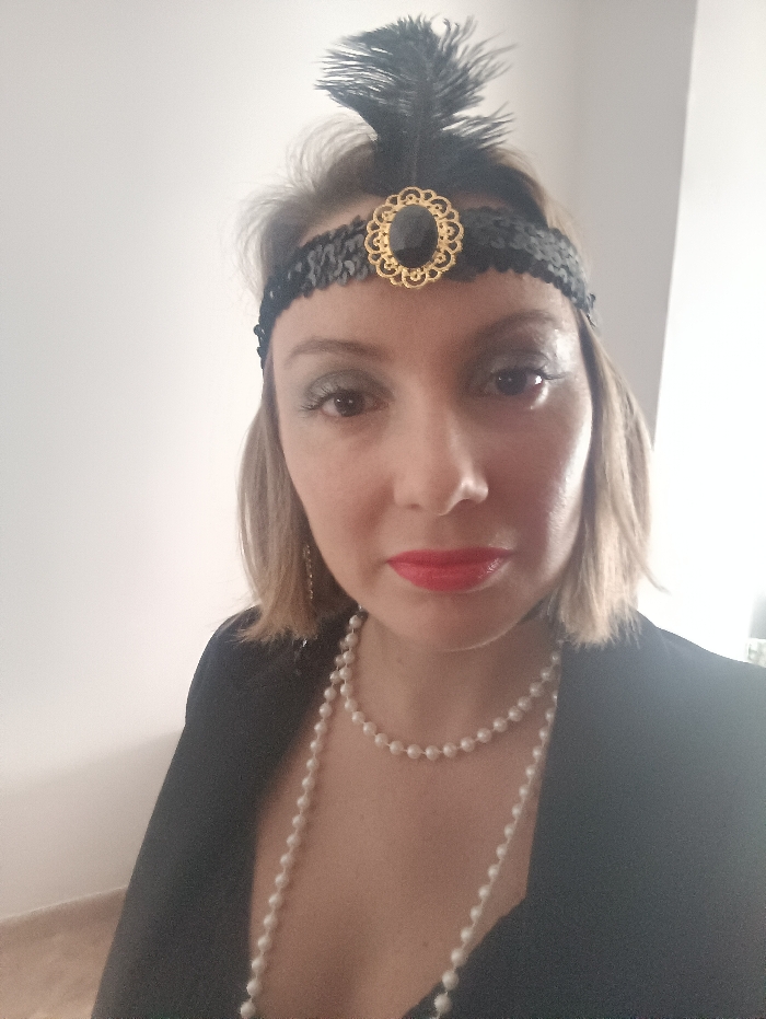 A forensic description of the scene in Sagunto, Spain. The image displays a frontal, chest-up portrait of an adult female positioned centrally in an indoor setting. She has shoulder-length light brown hair and is wearing red lipstick and dark eye makeup. Adorning her head is a black sequined headband, featuring a central gold-toned oval medallion with a black cabochon and a prominent vertical black feather plume. She is dressed in a black garment and wears two necklaces composed of white pearl-like beads, one shorter and one longer. The background consists of a plain, light-toned wall. No other individuals or significant environmental details are discernible.