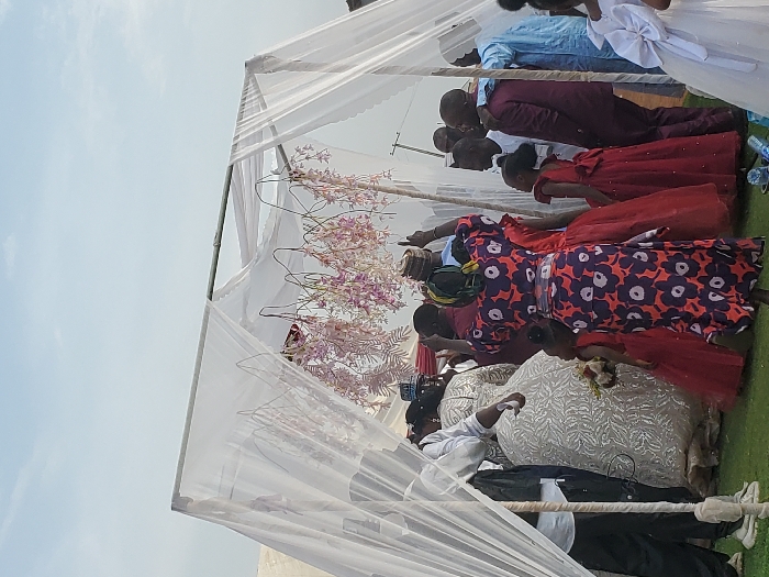 The image displays an outdoor celebratory event in Mangu Town, Nigeria, centered around a temporary canopy structure