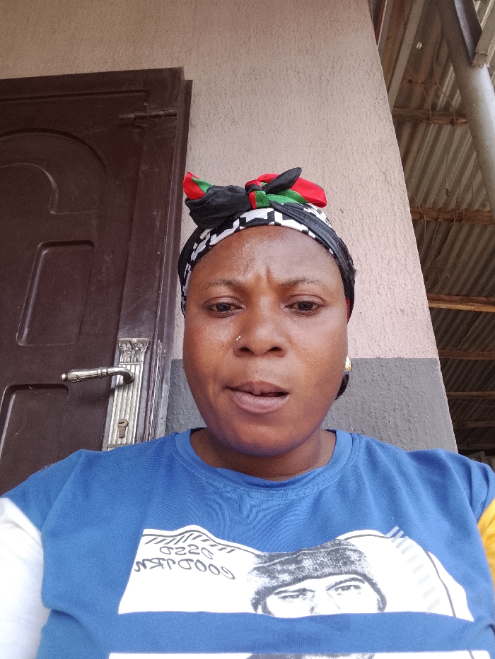 A female subject, appearing to be an adult, is depicted in a chest-up portrait against an outdoor or semi-outdoor background in the city of Unknown, Unknown. She has a medium complexion, a slight furrow in her brow, and her mouth is slightly open. A small silver stud pierces her left nostril, and a gold-colored earring is visible on her right ear. Her head is covered by a black and white patterned headwrap, tied in a knot at the top, incorporating red, green, and black fabric. She wears a blue t-shirt with a white graphic print on the front, featuring partially legible text and the upper portion of a human face. White fabric is visible on her left arm, and yellow fabric on her right, indicating a multi-toned or layered garment. The background on the left displays a dark brown wooden door with an ornate silver-colored handle and keyhole. To the right, a textured light beige wall section is present, transitioning to a darker grey segment, above which a corrugated metal roof structure is visible.
