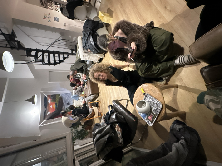 The image depicts an indoor social gathering within an apartment in Saint-Ouen-sur-Seine, France. Eight individuals are visible in a casually furnished living space with light wooden flooring and white walls. In the immediate foreground, a person's legs are partially visible, wearing green camouflage socks and dark pants. To their right, a woman with curly blonde hair and glasses, wearing a black vest and black pants, sits cross-legged on the floor, looking towards the left. Next to her right, another woman with lighter hair, dressed in a brown faux fur coat and olive green pants with striped socks, sits on the floor, looking down at a smartphone in her left hand while holding a cigarette in her right. Between the foreground figures and the blonde-haired woman, a small, light-colored wooden stool holds a dark speckled tray containing a grey ceramic ashtray, a yellow lighter, and small rectangular items. In the mid-ground, to the left, a dark brown leather armchair is covered with a black leather jacket. Behind it, a stack of framed artwork leans against the wall beside a large window or glass door. A green potted plant is situated nearby. Further back, a person in a white sweater leans over an individual seated in an orange collapsible chair. To the right of the orange chair, a dark brown coffee table is surrounded by multiple individuals. Two men are seated on a light-colored sofa, one in a dark hoodie, the other in a light long-sleeved shirt, engaging with food items (pizza slices) and drinks on the table. Another person is partially visible behind the table. A white sofa to the right of the coffee table has dark clothing draped over it. In the background, a large colorful tapestry featuring a landscape with a prominent sunset or sunrise hangs on the back wall. Above it, a white pendant light is visible. To the right of the tapestry, a white door is visible. Further right, a black metal spiral staircase ascends along a white wall, where "happy birthday" is inscribed in dark lettering. A yellow gift bag rests on the floor near the staircase base. The room is illuminated by multiple overhead lights, including two pendant lights with conical shades.