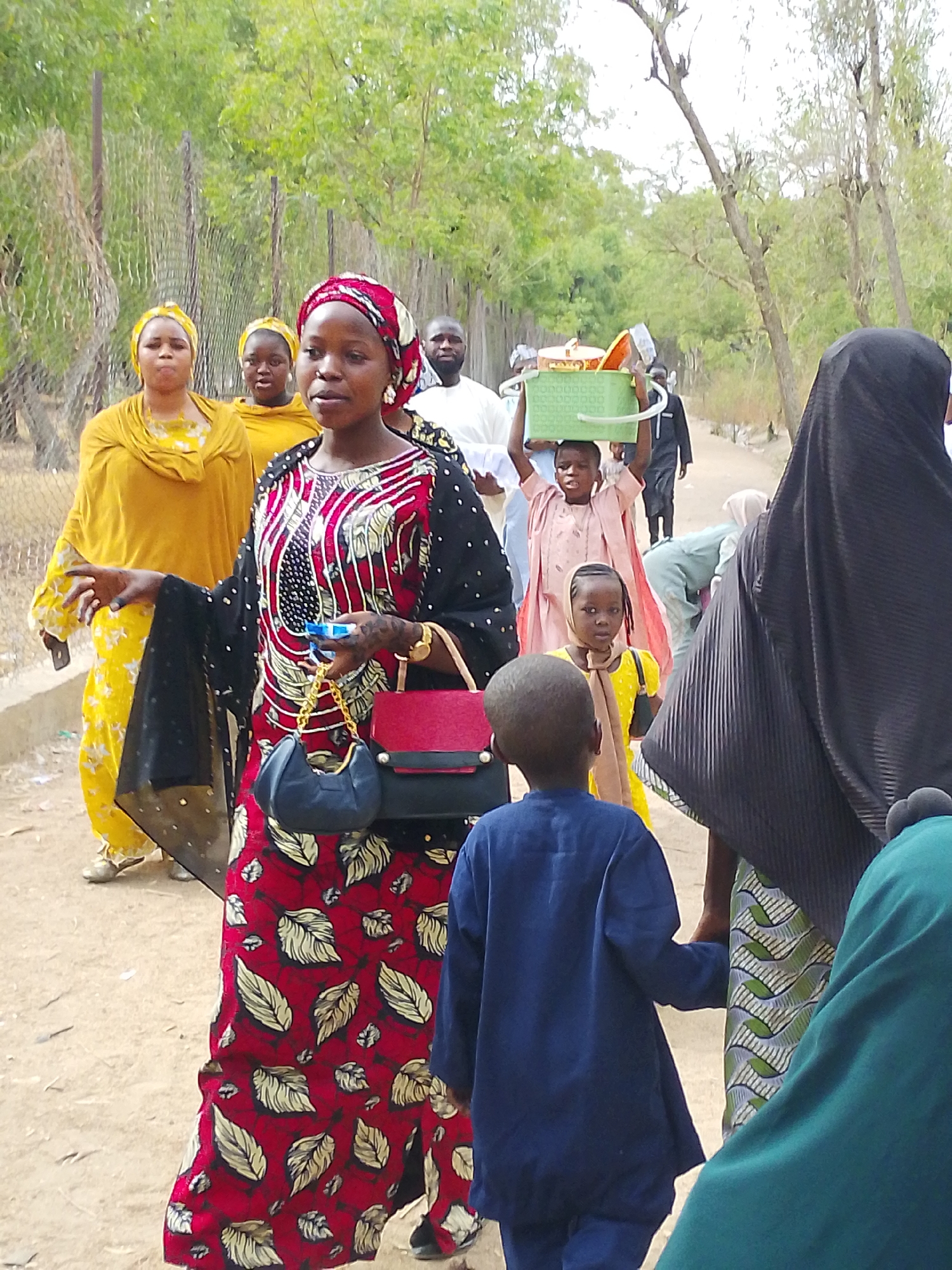 group of people walking on a dirt road in Gandu Albasa, Nigeria. The focus is on a woman in the foreground wearing a long, red and black patterned dress, a red headscarf, and carrying two small purses. Behind her are other women in yellow dresses and headscarves. Further back, a man in white carries a container on his head, and a young child also carries a basket on their head. A child in a yellow dress and a child in blue are also visible. The environment appears to be outdoors, with trees and a fence in the background.