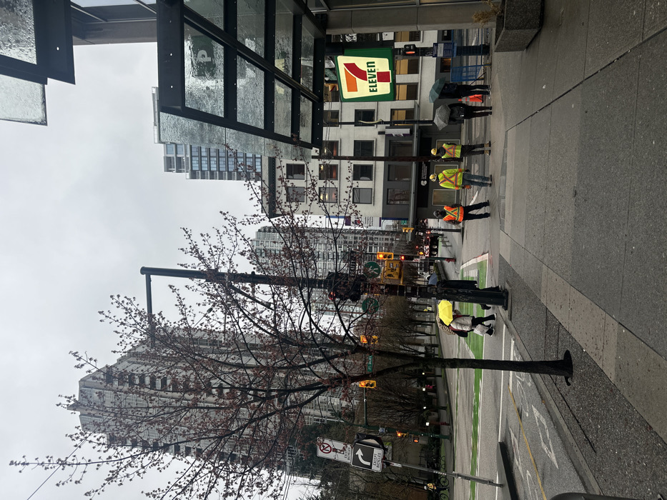 This image depicts the intersection of Beatty Street and West Georgia Street in Vancouver, British Columbia, Canada, under an overcast sky. The street is wet, indicating recent precipitation. In the foreground, a dark-trunked tree with sparse, reddish foliage stands on the left sidewalk. To its left, a green-painted bicycle lane is visible on the street, alongside white directional arrows. Traffic lights at the intersection display amber signals. Tall, modern high-rise buildings dominate the background, particularly on the left side of the frame. On the right side of the image, a multi-story building features a ground-level 7-Eleven convenience store, identifiable by its illuminated green and orange sign. A glass and steel canopy extends from this building over the sidewalk. Eight individuals are present. Four individuals, presumed workers, stand on the right-hand sidewalk near the 7-Eleven. They are all oriented away from the viewer, wearing high-visibility vests (two orange, two yellow/lime green) and hard hats. Two orange traffic cones are positioned near this group. Two pedestrians are mid-crossing the street from left to right; one holds a bright yellow umbrella, the other a dark umbrella. Further left, a person on a bicycle, wearing a yellow high-visibility vest, is situated in the green bike lane. Another individual with a dark umbrella is partially visible on the far-left sidewalk. Street signs, including "BEATTY ST.," "No Stopping Except Bicycles," and "Right Turn Only Except Bicycles," are visible on poles. A white utility truck is parked further down the street to the right.