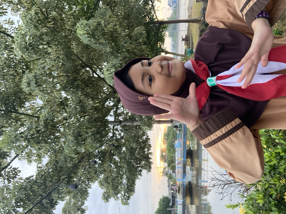 young girl outdoors in Kalitengah, Indonesia, under an overcast sky with a warm, orange-yellow glow on the horizon indicating either sunrise or sunset. The girl, appearing to be of elementary school age, is positioned centrally, smiling and looking towards the right side of the frame. She wears a brown textured hijab with a gold-colored emblem, a brown and tan uniform top featuring two horizontal brown stripes on the sleeves, and a red and white scarf secured with a green and white woggle. Her left hand is raised in front of her face with fingers splayed, and her right hand is also slightly raised, displaying a purple beaded bracelet on her wrist. In the background, a body of water spans the mid-ground, crossed by a multi-colored bridge (blue, yellow, white sections) on which faint human figures are discernible. Distant buildings and sparse trees are visible beyond the bridge. Overhead, a string of dark-colored suspended lights is visible. The upper background is dominated by a large tree with green and light-colored variegated leaves. Green bushes with small yellow flowers are present in the lower left foreground.