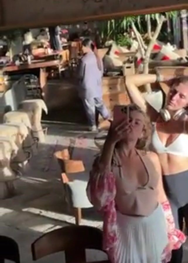 Two young women stand in front of a mirror, taking a selfie with a smartphone. The woman on the left wears a low-cut top with floral sleeves and a white pleated skirt. The woman on the right is wearing a white sports bra and black leggings, with headphones around her neck. They are in a brightly lit space that appears to be a restaurant or cafe, as suggested by the visible tables, chairs, and other patrons in the background. The mirror is framed with a rustic wooden border. Sunlight is streaming into the room, creating shadows and reflections. One person in the background is wearing a purple jumpsuit.