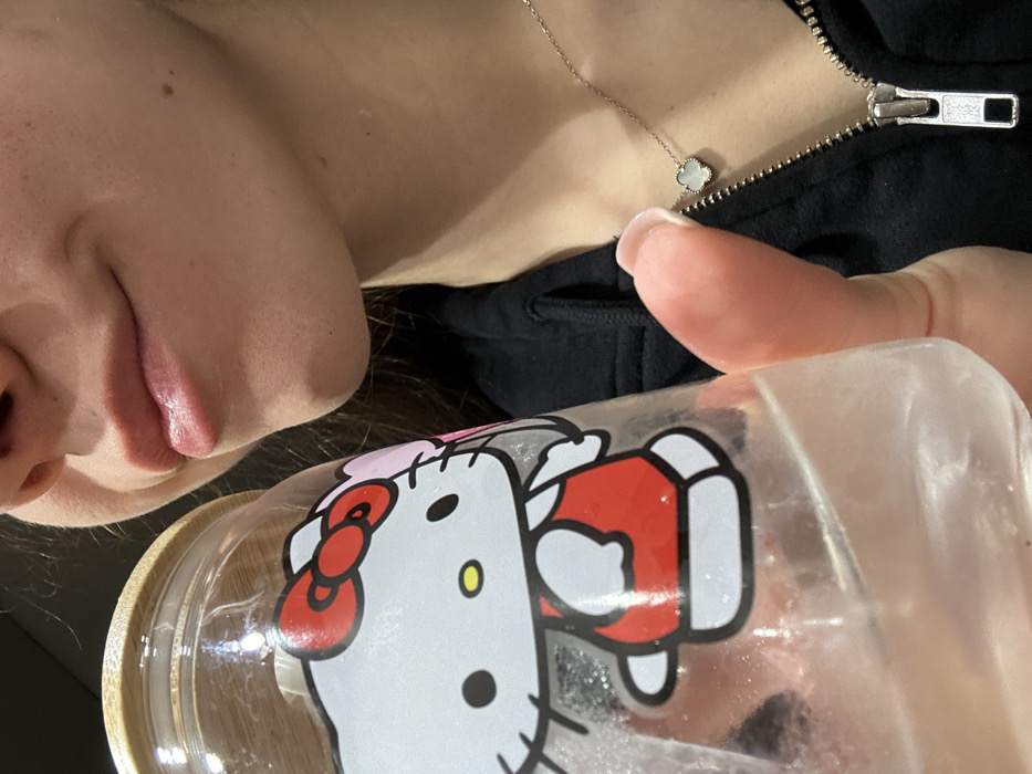 The image depicts a close-up view of an individual holding a clear beverage bottle, located in Pernik, Bulgaria. The subject's lower face, neck, and right hand are visible. The individual has light skin, with the lower part of the nose, full lips, and chin prominently featured. The lips appear slightly glossy. A small mole or blemish is present on the lower right cheek/jawline area. A thin silver chain necklace with a white four-leaf clover pendant is worn around the neck. The subject is wearing a black zippered garment, possibly a hooded sweatshirt or jacket, partially unzipped. The right hand holds a transparent bottle, which has a bamboo-style lid. The bottle contains a clear liquid and is adorned with a "Hello Kitty" decal showing the character in a red dress with a red bow, holding a pink balloon. Condensation or bubbles are visible within the bottle. The background is dark and out of focus, providing no discernible environmental details other than its indoor nature.