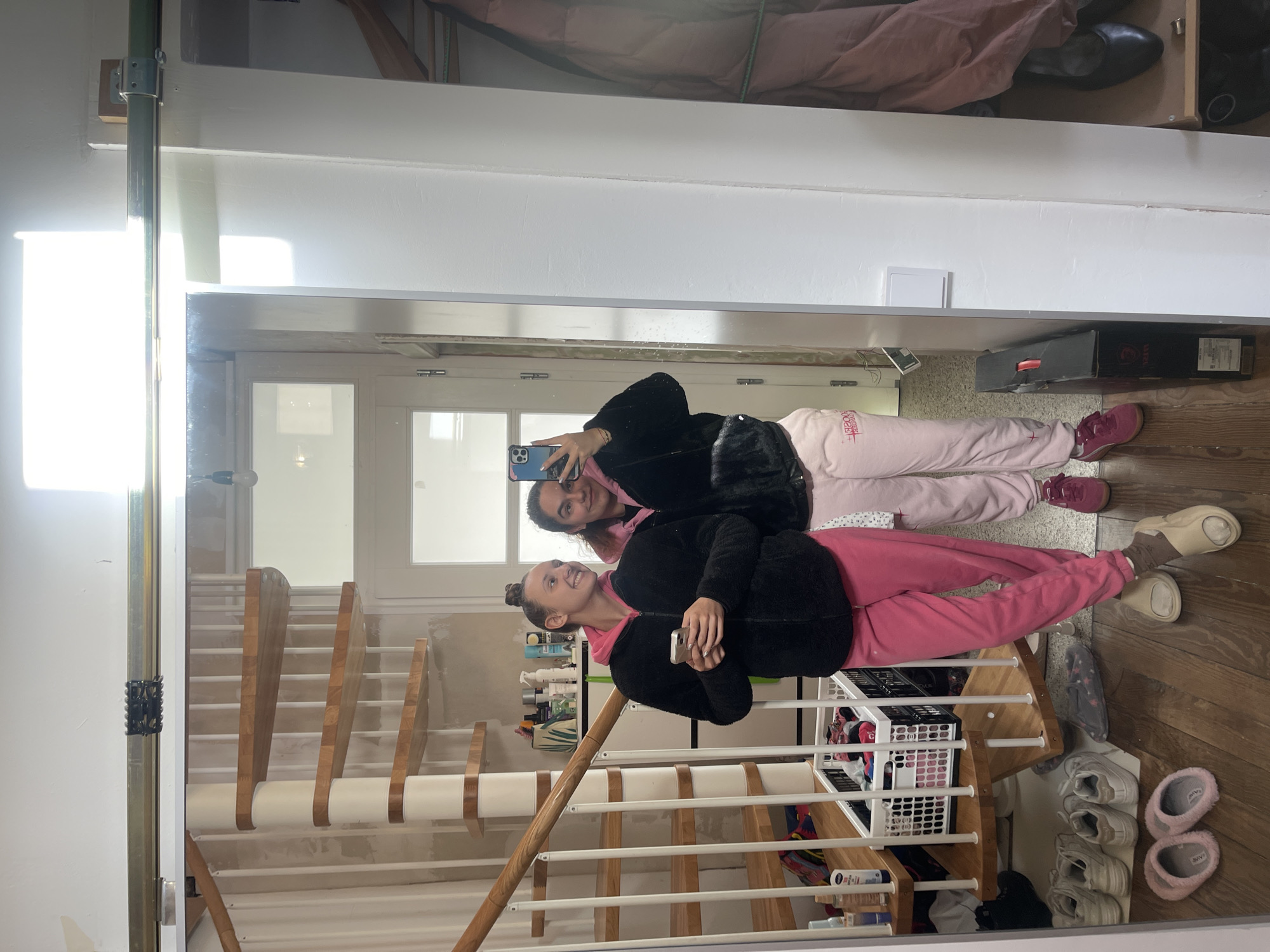 Two women in pink sweatpants and dark jackets stand in front of a full-length mirror indoors, taking a selfie