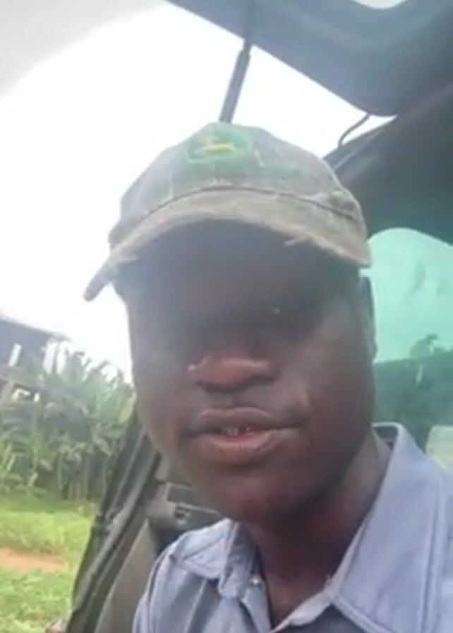 A man wearing a light blue shirt and a faded camouflage baseball cap is standing in the open back of a car. He faces the camera and makes a peace sign with his fingers. The background shows a landscape with greenery and some buildings. The sky is overcast.