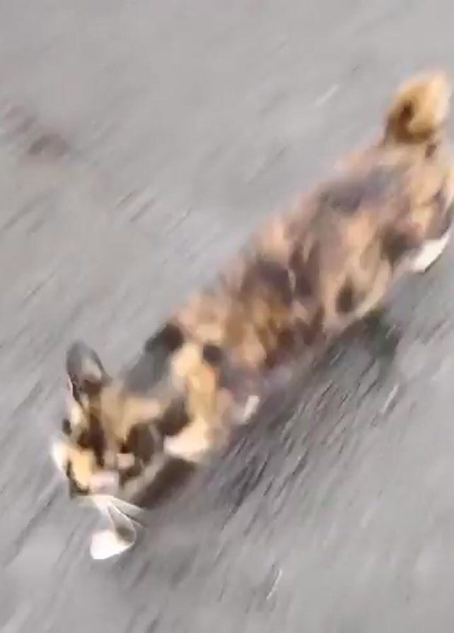 A cat with a mottled brown, tan, and black coat walks across a gray, wet asphalt surface. A person's foot wearing a light-colored sandal is briefly visible as the cat continues to move forward.