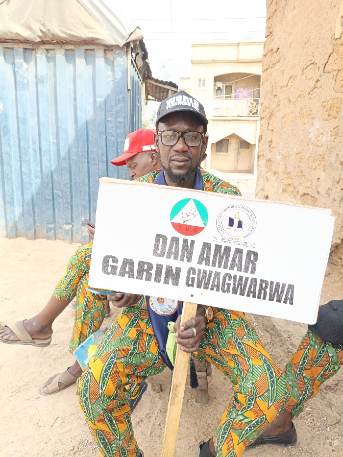 The image depicts three individuals outdoors in Gawuna, Nigeria, during daytime. In the foreground, a dark-skinned adult male with a beard, wearing a black "WORLD TEACHERS' DAY" baseball cap, clear-framed eyeglasses, a blue polo shirt, and a colorful yellow, orange, and green patterned African print outfit, directly faces the camera. He wears a ring on his left ring finger and a watch on his left wrist. He holds a white rectangular sign with a wooden stick. The sign displays black text "DAN AMAR GARIN GWAGWARWA" and features two logos: a circular green, white, and red triangle with a fist, labeled "TUC," and another logo depicting a stylized torch/candle with the text "THE ACADEMIC STAFF UNION OF SECONDARY SCHOOLS (ASUSS) KANO STATE CHAPTER NIGERIA." Behind and to the left of the main subject, a second dark-skinned adult male is partially visible, wearing a red baseball cap and a similar colorful African print outfit. His face is mostly obscured, and his legs, clad in brown sandals, are visible, suggesting he is seated or crouching. A third individual's leg, wearing a black shoe and a similar African print outfit, is partially visible on the far right of the frame. The environment includes sandy ground. To the left, a blue corrugated metal structure is visible. To the right, a textured light brown wall, possibly mud or stucco, is present. In the background, a multi-story building with windows and balconies is discernible.