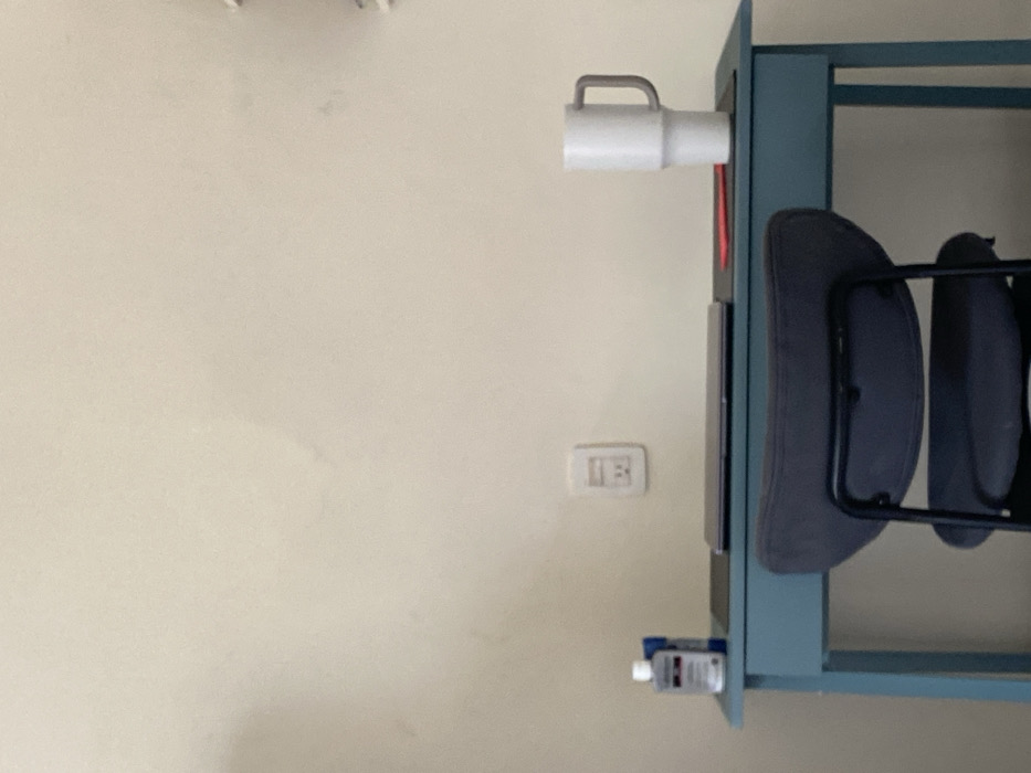 The scene depicts an unoccupied interior workspace. A light cream-colored wall, exhibiting faint marks and smudges, serves as the background. Mounted on the wall, slightly left of center and above the desk, is a white electrical outlet. A light blue-green wooden desk stands against the wall. On its surface, situated on a dark rectangular mat, are several objects. From left to right: a small white bottle with a dark cap and a discernible label, a smaller blue object adjacent to it, a closed dark-colored laptop, a red rectangular object, and a tall, two-tiered white insulated travel mug with a gray handle. A dark gray upholstered chair with a black metal frame is positioned with its back towards the viewer, facing the desk. No individuals are present, and no actions or interactions are depicted. The image provides no visual information or metadata to determine a specific location within a city in Veracruz, Mexico.