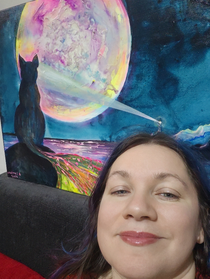 A woman with fair skin and blue-tinged hair smiles slightly at the camera. Behind her is an abstract painting of a black cat silhouetted against a large, colorful moon. The moon emits a beam of light towards a small figure in the distance. A body of water and vibrant, swirling land elements are beneath the moon, set against a dark blue sky. The painting is signed "Natalia A 2023."