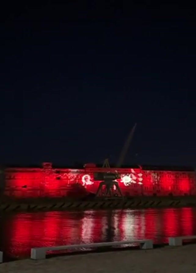 At night, a harbor building with a large crane is illuminated with red lighting and dynamic white projections, which reflect off the water in front of the building